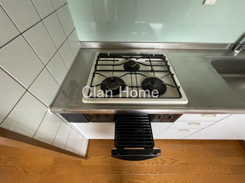 大きなキッチンはグリル付きの3口ガスコンロのシステムキッチンでお料理する方であれば手の込んだお料理もできると思いますのでオススメです。単身用のお部屋だと1口コンロか、あっても2口コンロが多い中、3口コンロがあるのはとても希少価値の高いお部屋です。キッチン周りのスペースも広くてストレスなくお料理していただけると思います。